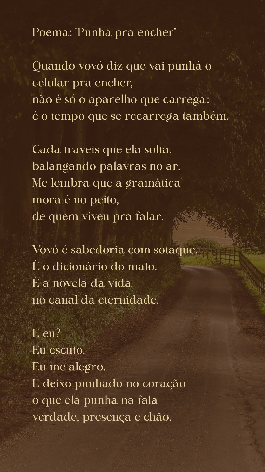 E eu escuto, porque ali ela é — é memória viva, de um idioma que carrega terra, tempo, ternura. O “punhá pra encher” é mais que uma expressão: é afeto em forma de som, é mundo rural costurado em vocábulos que escapam da norma para revelar o que é essencial.