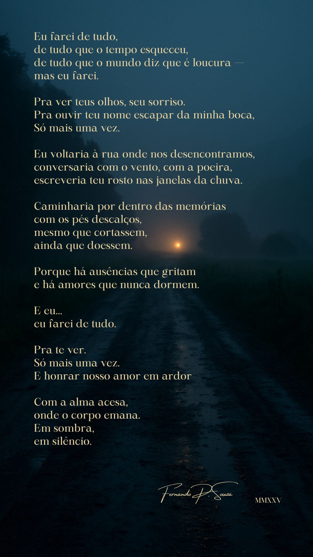 Um poema sobre ausências que não terminam. Sobre a permanência do amor mesmo depois da partida. Sobre a coragem de lembrar, de caminhar por dentro da dor com os pés descalços e a alma acesa.